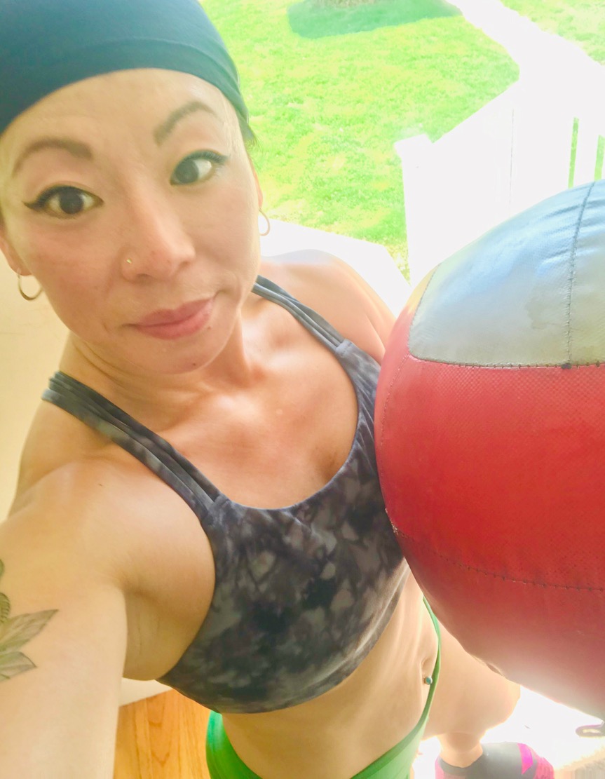 I attempted this with a 25# KB but I couldn’t quite get it on my left side so I went down to my 15#. Also did knee push ups.